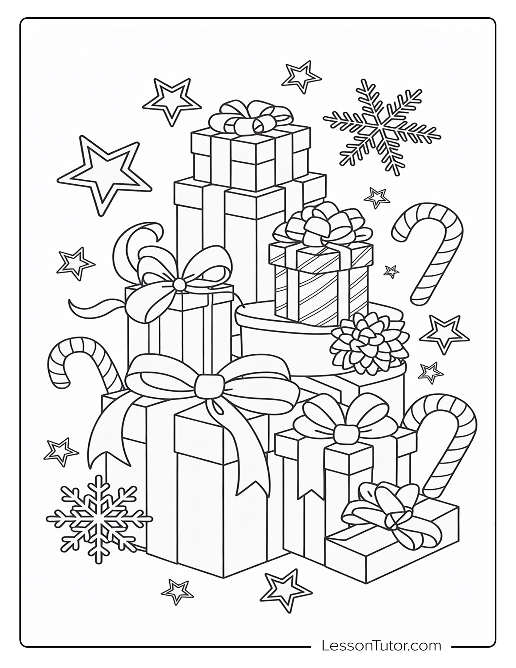 Celebrate the excitement of Christmas morning with this enchanting collection of 5 high-quality coloring pages all about holiday presents! From a towering stack of beautifully wrapped presents sparkling with ribbons and bows to an adorable puppy popping out of a gift box, each page captures the joy, surprise, and magic of gift-giving. You’ll also find Santa surrounded by a large pile of beautifully wrapped presents, ready to share Christmas cheer with everyone. Whether you’ve always loved the magic of Christmas or are discovering its wonder for the first time, this collection invites you to color the season with creativity, warmth, and festive excitement.