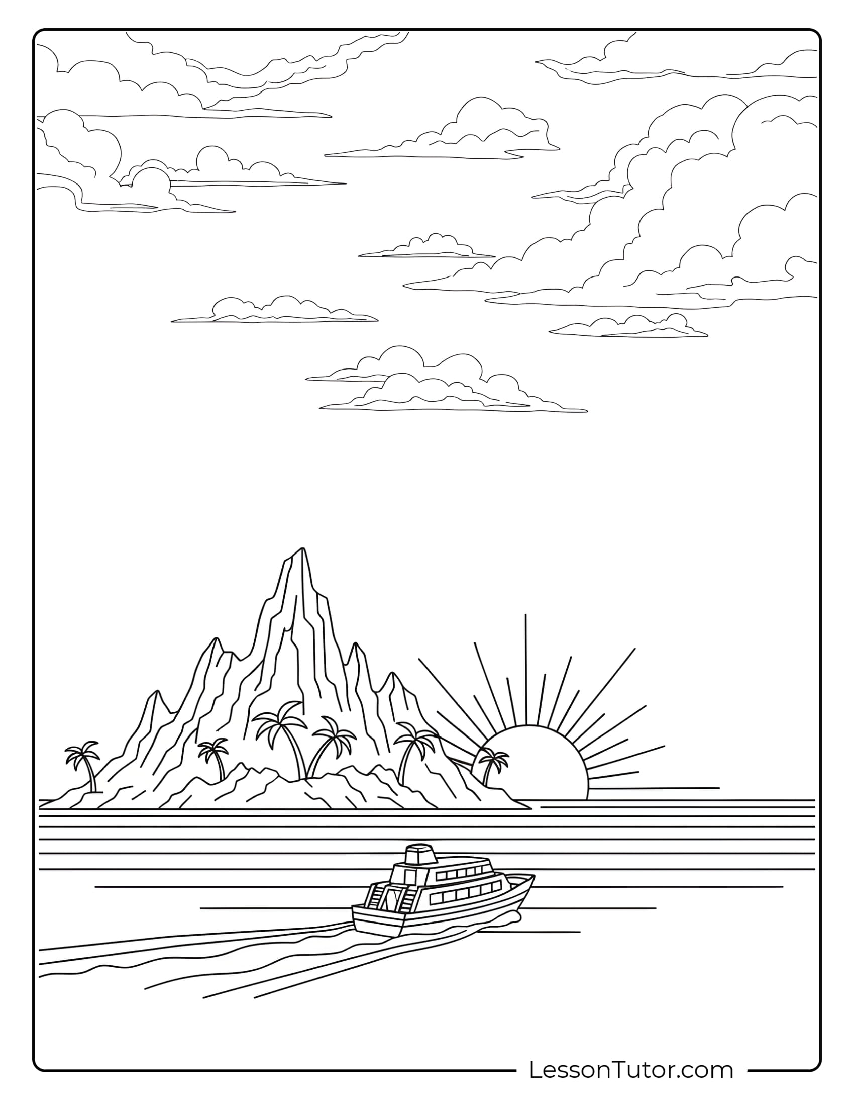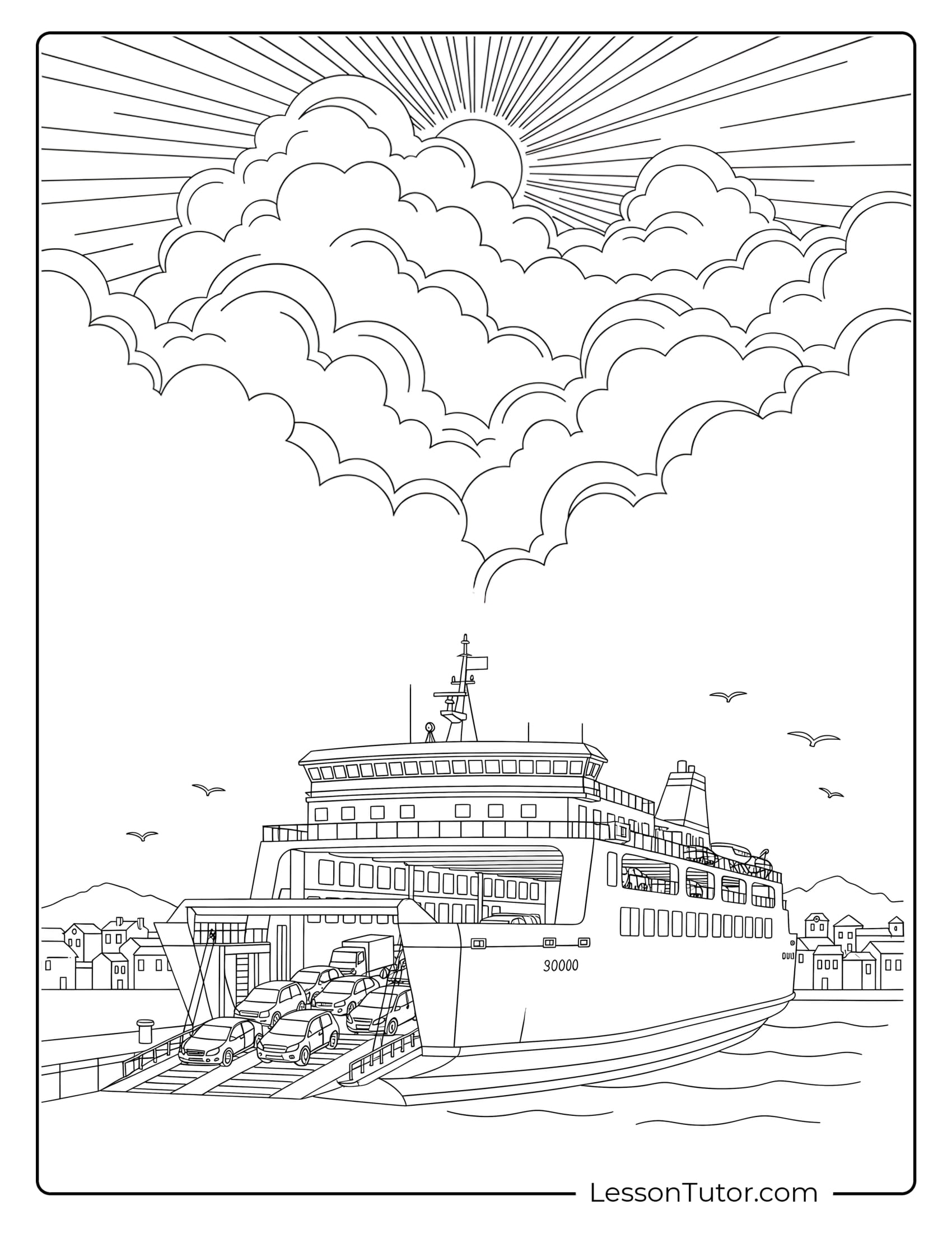 Set sail on a relaxing maritime adventure with this charming collection of 5 high-quality Ferry Coloring Pages, designed to spark imagination and a love for the sea! From a distant island with a ferry approaching to a ferry crossing a calm ocean at sunset, each illustration captures the serenity and beauty of coastal travel. You can even explore the bustling scene of a ferry loading vehicles, bringing the excitement of journeys big and small to life. Perfect for kids, adults, and travel enthusiasts alike, this collection offers a peaceful voyage through waves, harbors, and horizons waiting to be colored with your creative touch.