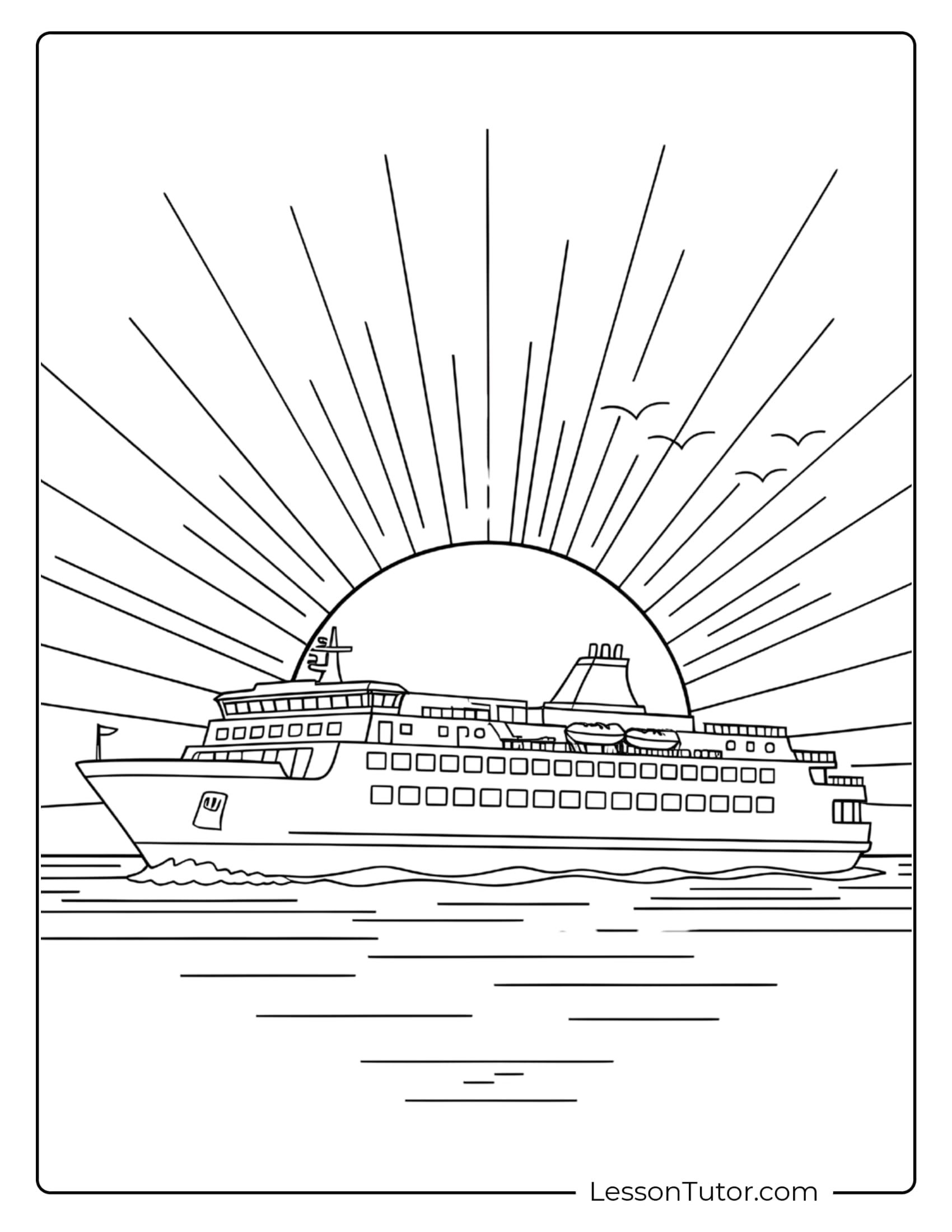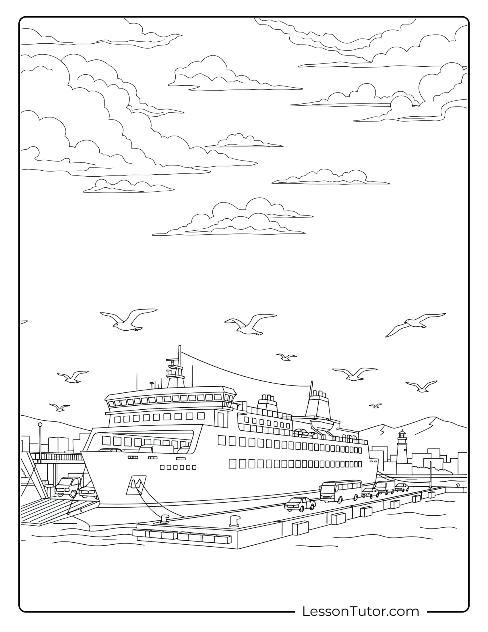 This engaging collection captures the beauty and movement of ferry travel across the open sea. Imagine a distant island with a ferry approaching, its silhouette framed by the horizon, or a ferry crossing a calm ocean at sunset, glowing in warm golden tones as the day fades. You’ll also find lively scenes of a ferry loading vehicles, bustling with energy as travelers prepare for their next destination. From peaceful coastal crossings to busy harbor moments, these coloring pages bring the charm and adventure of maritime life to every stroke, perfect for ocean lovers and creative explorers alike.