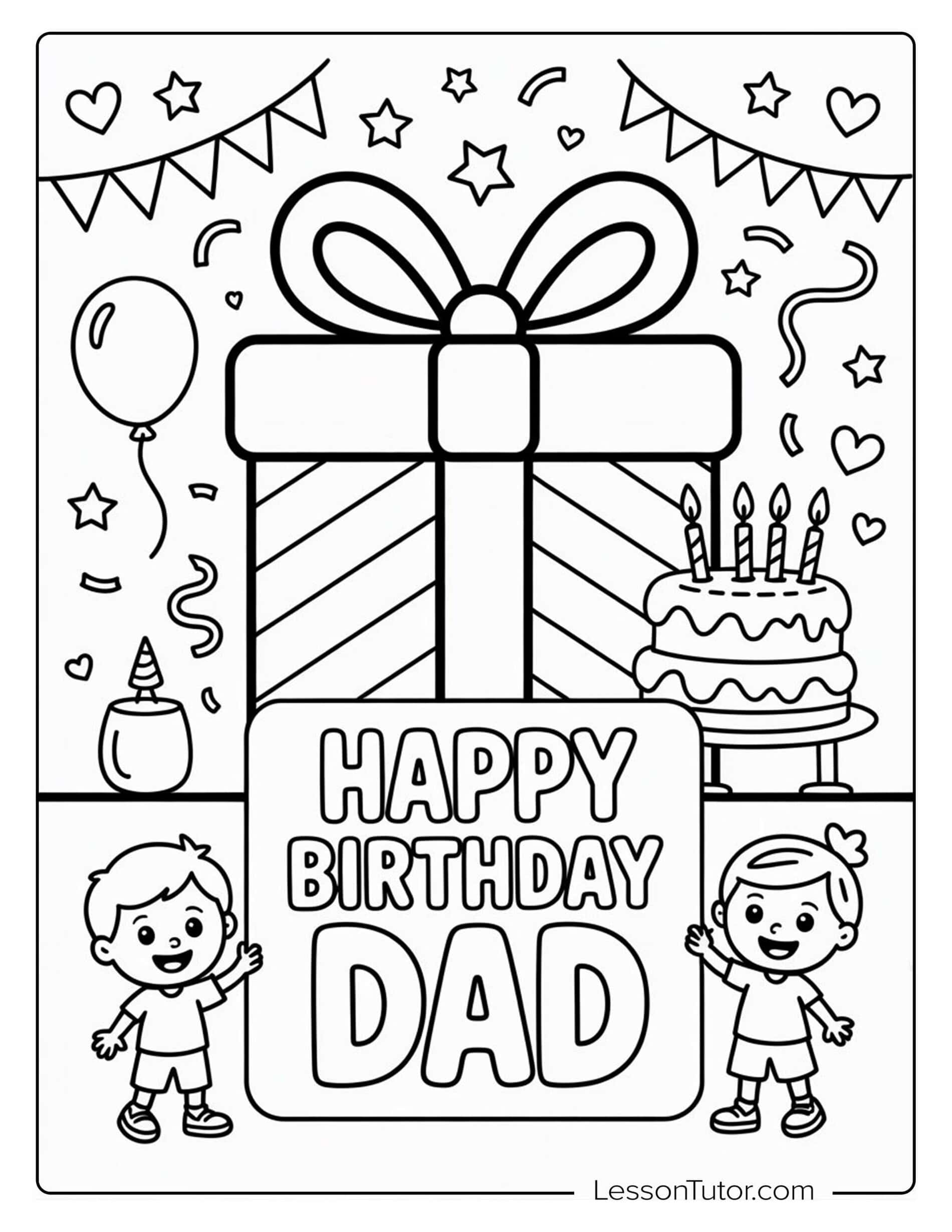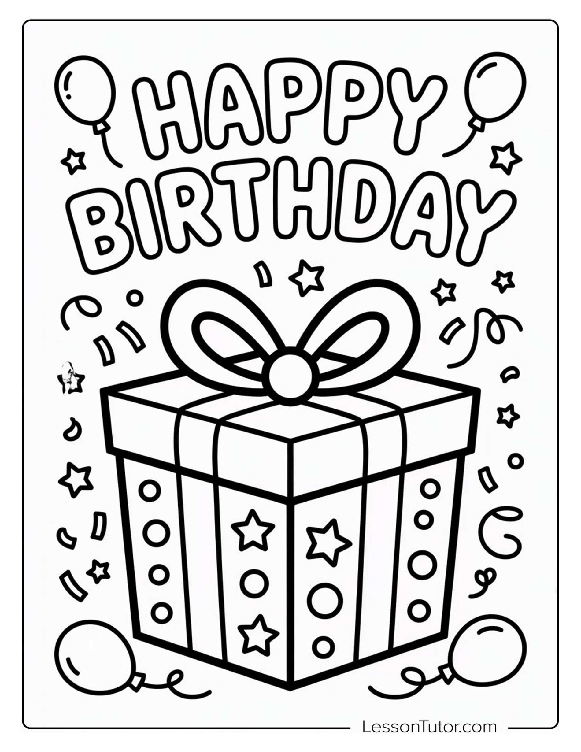 This birthday-themed coloring set features drawings of cakes with candles, balloons, confetti, party banners, and simple festive decorations. After coloring, pages can be turned into handmade birthday cards, folded into small gift tags, or used as placemats for a birthday table. Finished pages can also be displayed as part of simple party décor or collected into a small birthday activity booklet. These ideas help children use Happy Birthday Coloring Pages not only for coloring practice but also for basic creative crafts linked to real celebrations.