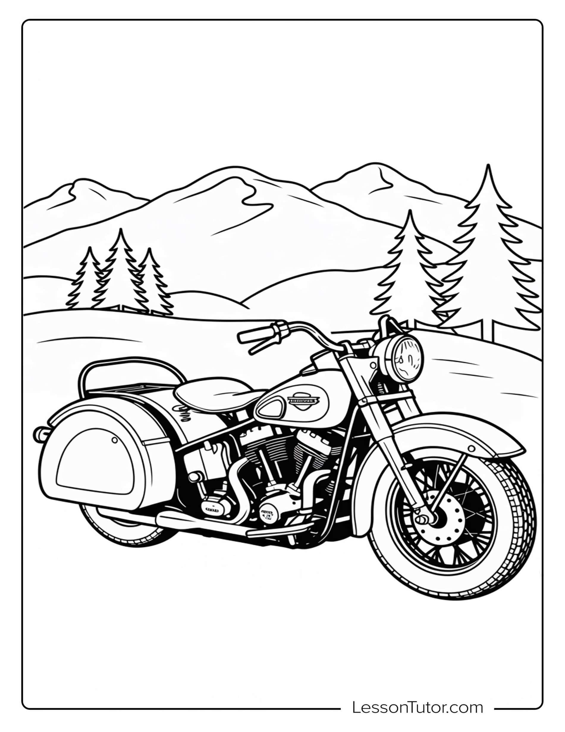 Download 10 free, high-resolution printable Harley Davidson Coloring Pages and bring a motorcycle theme into your creative time. These pages are easy to print and can be used at home, in classrooms, or during vehicle-themed activity sessions. Some illustrations show classic motorcycles parked and ready for display, while others suggest motion and travel on scenic roads. This collection offers a practical, screen-free way for children interested in motorcycles and vehicle design to express creativity through coloring.