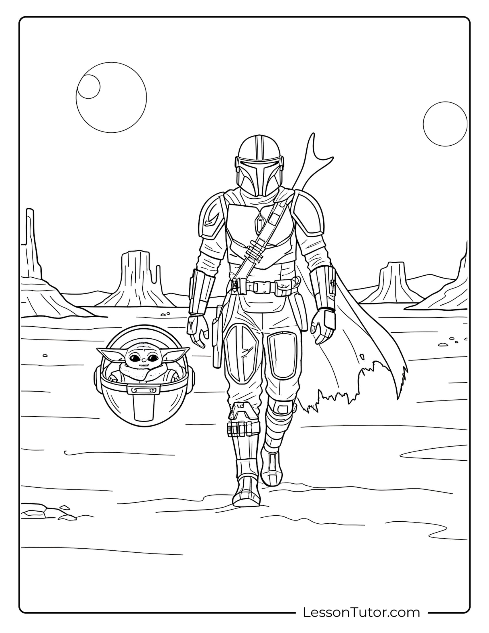 Unleash your creativity and journey to a galaxy far, far away with this epic collection of 10 Mandalorian-themed coloring pages, perfect for fans and artists of all ages! This set brings the Star Wars universe to life with detailed scenes, including the iconic Mandalorian crest and armor, Mando walking across a vast desert landscape, and an intense battle moment with his spear in hand. Whether you’re a longtime Star Wars enthusiast or a newcomer to the adventures of Din Djarin, these pages offer the perfect way to relax, get inspired, and celebrate the spirit of the Mandalorian. This is the way, to color and create!