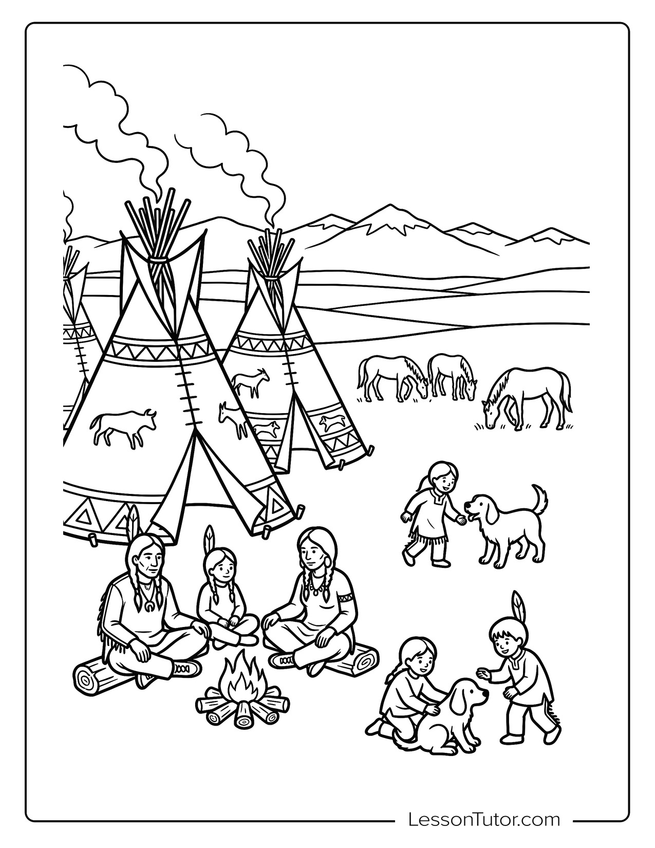 - Teepee Diorama: Color the village scene, then roll a piece of tan paper into a cone and decorate it with the geometric patterns from the teepee page to create a 3D teepee model.