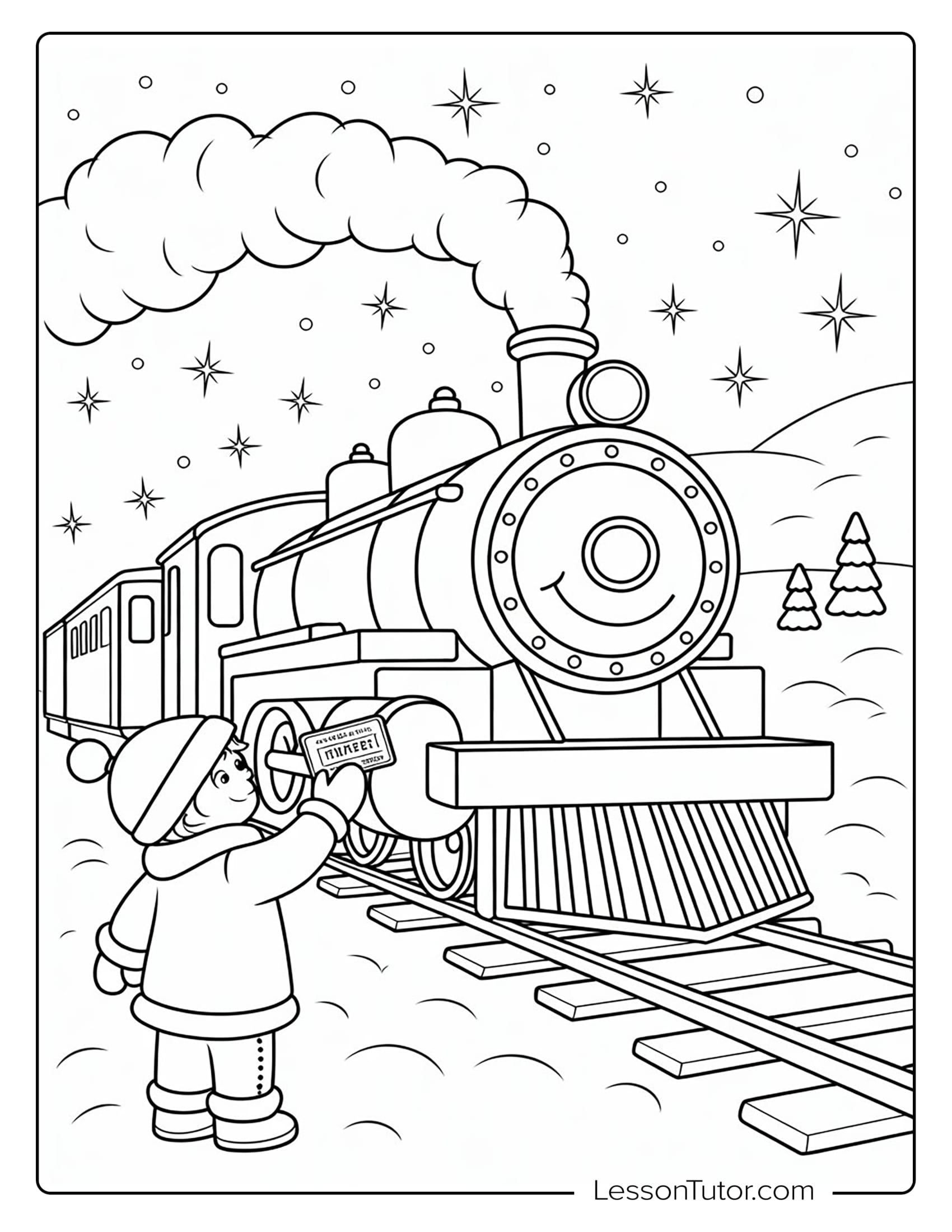 This magical set also features four adorable children seated inside the train, holding steaming mugs of hot cocoa as they gaze out at the snowy world beyond, a traditional steam train roaring across the tracks with billowing clouds of smoke, and the iconic moment when a child holds up a golden ticket toward the train, ready to believe in the journey ahead. You’ll also discover cozy cabin scenes filled with twinkling lights, children bundled up in winter pajamas, and breathtaking views of the Polar Express gliding through starry skies. Whether you love simple outlines, watercolor-style templates, or detailed stencils inspired by The Polar Express, this collection brings creativity, wonder, and educational fun to every coloring page. All aboard the magic!